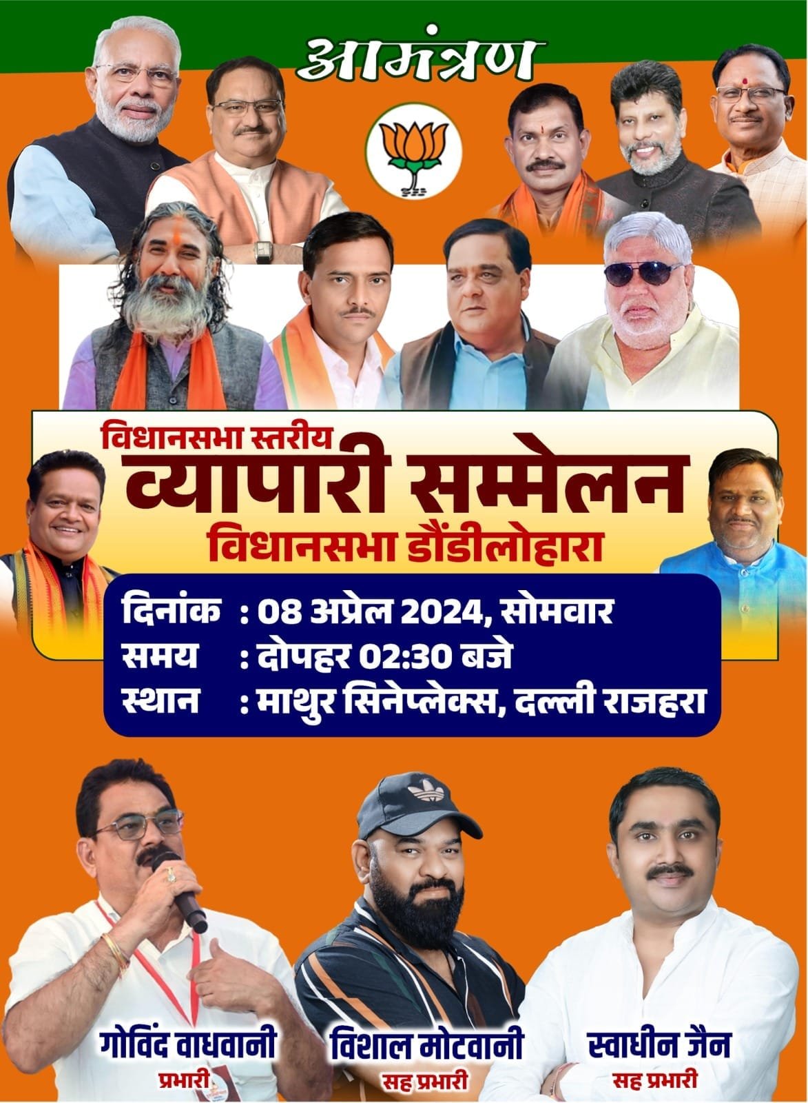 नवभारत news 24/रमेश मित्तल / दल्लीराजहरा। गोविंद वाधवानी प्रभारी व्यापारी सम्मेलन विधानसभा स्तरीय ने बताया कि कल 8 अप्रैल 2024 को माथुर सिनेफ्लेक्स दल्लीराजहरा में दोपहर 2.30 बजे से शाम 4 बजे तक विधानसभा स्तरिय व्यापारी सम्मेलन का आयोजन किया जा रहा है जिसमें प्रदेश स्तर के भाजपा के नेताओं का आगमन होना है ।