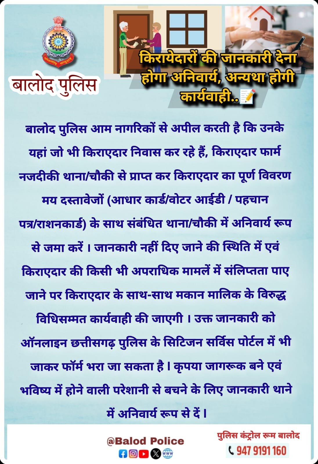 बालोद पुलिस आम नागरिकों से अपील करती है कि उनके यहां जो भी *किराएदार निवास कर रहे हैं, किराएदार फार्म नजदीकी थाना/चौकी से प्राप्त कर किराएदार का पूर्ण विवरण मय दस्तावेजों (आधार कार्ड/वोटर आईडी / पहचान पत्र/राशनकार्ड) के साथ संबंधित थाना/चौकी में अनिवार्य रूप से जमा करें* ।