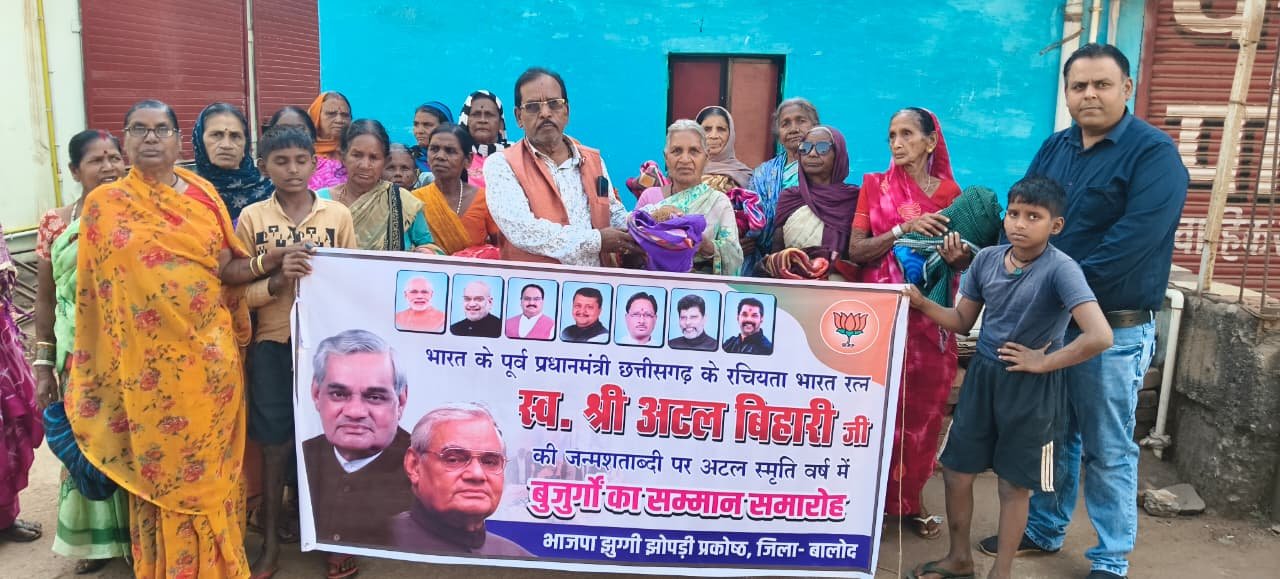 भाजपा झुग्गी झोपड़ी प्रकोष्ट जिला बालोद के दल्लीराजहरा में अटल बिहारी बाजपेयी जी जयंती पर बुजुर्गों का किया गया सम्मान।