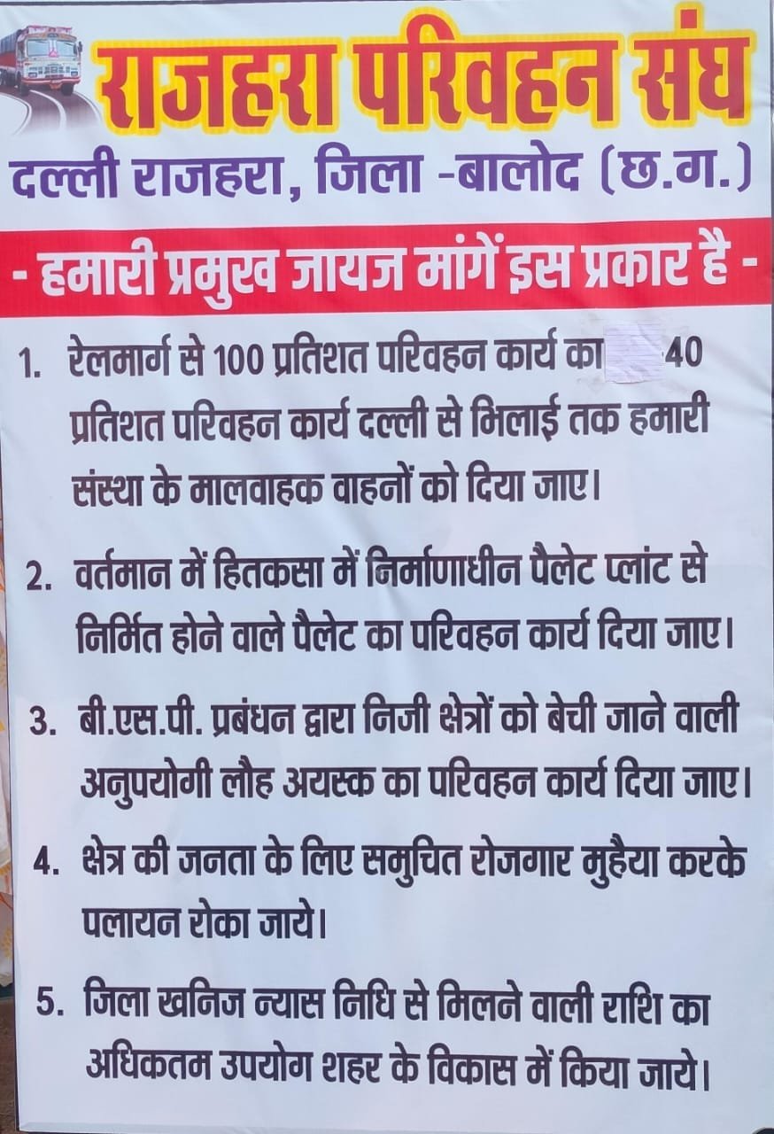 संघ की यह है पांच प्रमुख मांगें -रेलमार्ग से 100 प्रतिशत परिवहन कार्य का 40 प्रतिशत परिवहन कार्य दल्ली से भिलाई तक हमारी संस्था के मालवाहक वाहनों को दिया जाए। वर्तमान में हितकसा में निर्माणाधीन पैलेट प्लांट से निर्मित होने वाले पैलेट का परिवहन कार्य दिया जाए। बी.एस.पी. प्रबंधन द्वारा निजी क्षेत्रों को बेची जाने वाली अनुपयोगी लौह अयस्क का परिवहन कार्य दिया जाए।क्षेत्र की जनता के लिए समुचित रोजगार मुहैया करके पलायन रोका जाये।जिला खनिज न्यास निधि से मिलने वाली राशि का अधिकतम उपयोग शहर के विकास में किया जाये। धरना प्रदर्शन में राजहरा परिवहन संघ के अध्यक्ष नरेंद्र सिंह तुली, अतिंदर सिंह, राणे, सरबजीत सिंह, राजू मरवाह,राजकुमार कुकरेजा अनिल सुथार, इंदरजीत सिंह तुली, विजय प्रताप बग्गा, सुरेश बाघमार,कुलदीप सिंह ,सुनील जायसवाल अशोक लोहिया,कमल चोपड़ा,प्रशांत बोकड़े, सन्नी ओबेरॉय, सहित अनेक लोग उपस्थित थे।
