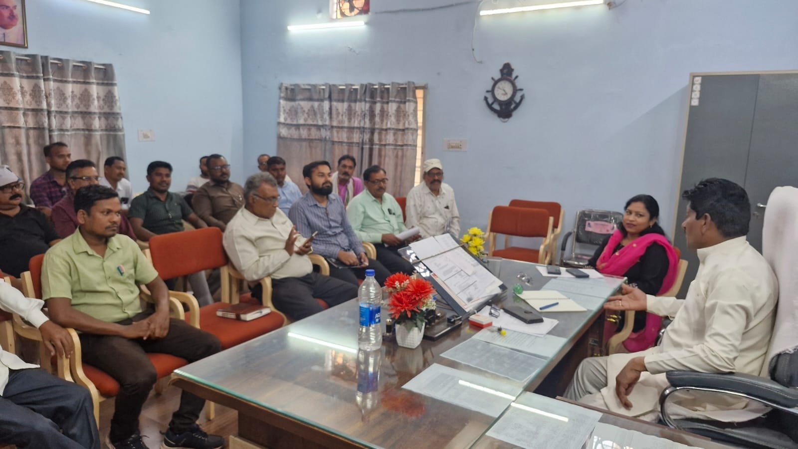 दल्लीराजहरा/ मुख्य नगर पालिका अधिकारी सीमा बक्शी द्वारा नगर पालिका अध्यक्ष तोरण साहू के कक्ष में सभी विभागों के कर्मचारियों का परिचय एवं समीक्षा बैठक आयोजित की गईl जिसमें मुख्य नगर पालिका अधिकारी सीमा बक्शी ने सीधे-सीधे अधिकारी कर्मचारियों को कहा कि आम जनता एवं जनप्रतिनिधियों की बातों को सम्मान देते हुए समस्याओं को गंभीरता से सुने एवं उनके निराकरण करने का सकारात्मक पहल करें l