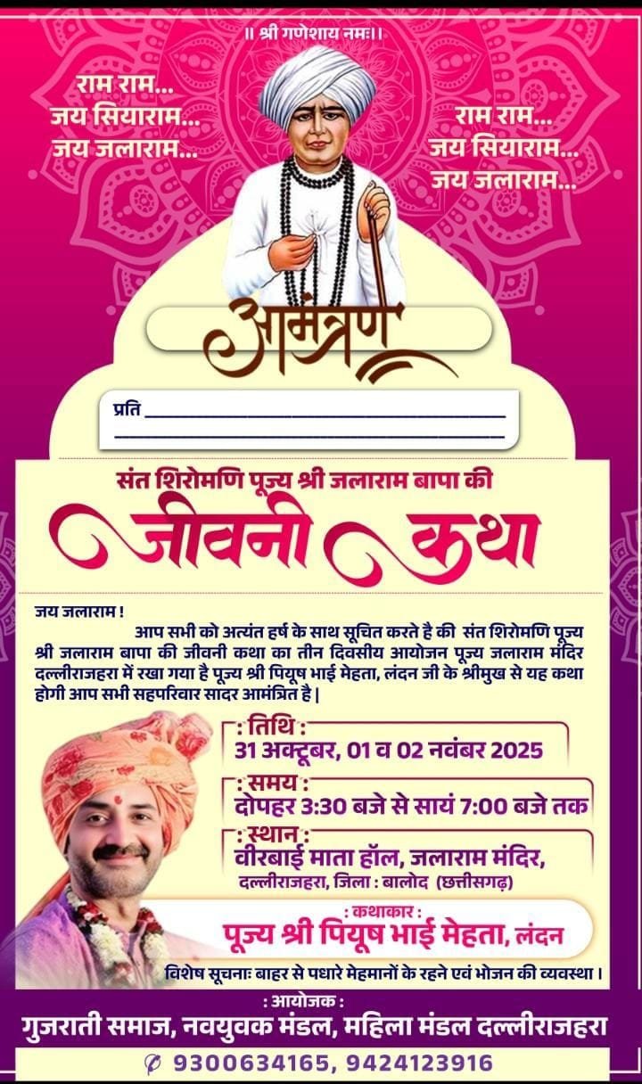 श्री जलाराम बापा की जीवनी पर 3 दिवसीय कथा कार्यक्रम 31 अक्टूबर से दल्लीराजहरा में।