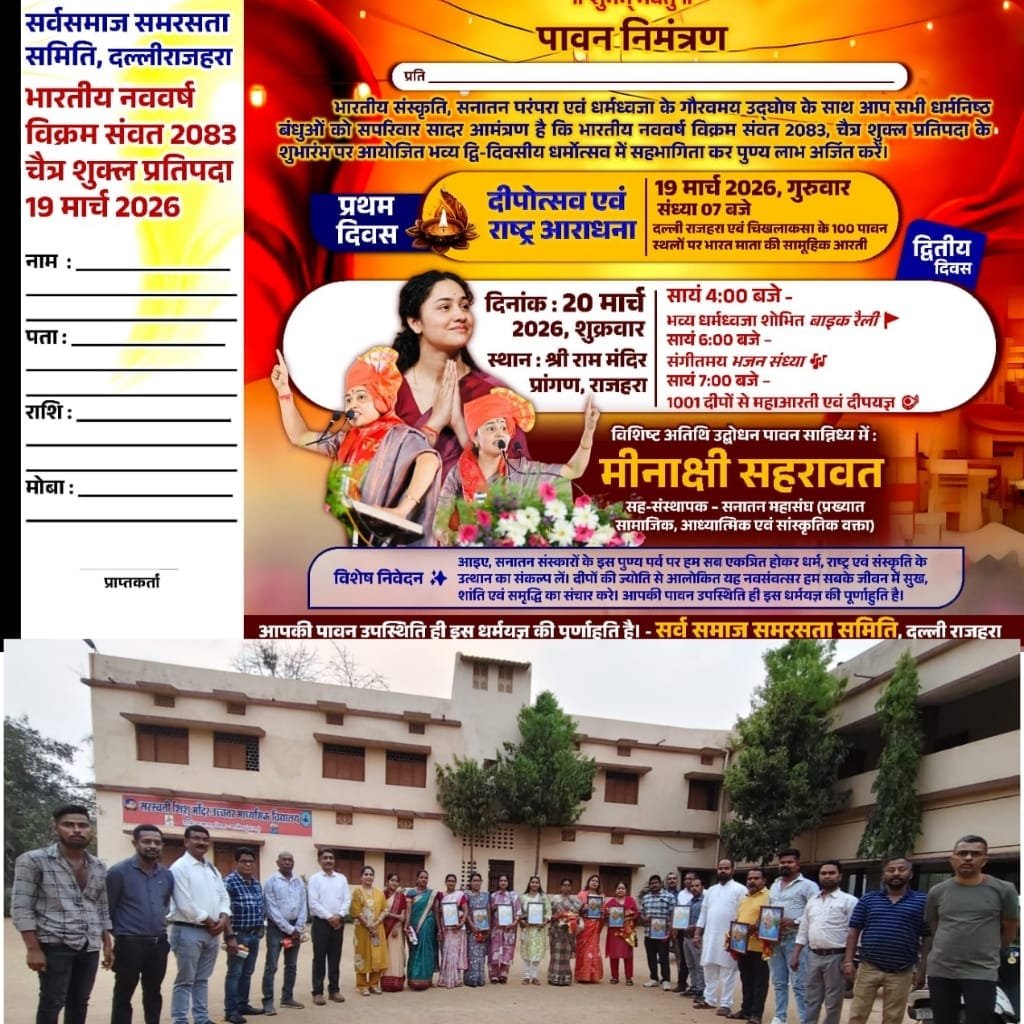 दल्लीराजहरा/ सर्व समाज समरसता समिति दल्ली राजहरा के अध्यक्ष पुरोबी वर्मा ने बताया कि इस भारतीय नव वर्ष विक्रम सम्वत. 2083 को धूमधाम से मनाने के लिए सर्व समाज समरसता समिति की ओर से दल्ली राजहरा में दो दिवसीय ( 19 एवं 20 मार्च 2026 को )विविध कार्यक्रम आयोजित किया जा रहा है l
