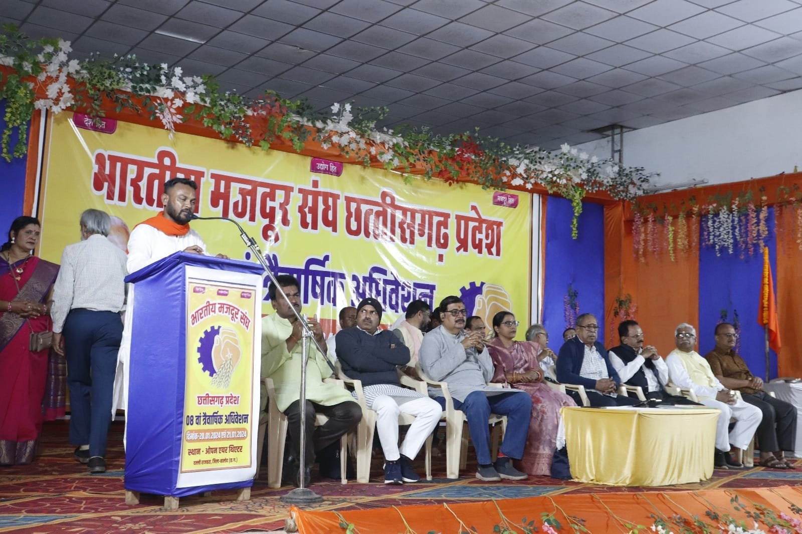 विगत दिनों श्रमिक आंदोलनों के लिए प्रसिद्ध छत्तीसगढ़ के बालोद जिले स्थित लौह अयस्क नगरी दल्ली राजहरा के ओपन एयर थिएटर में देश के सबसे बड़े श्रम संगठन भारतीय मजदूर संघ के छत्तीसगढ़ प्रदेश का आठवां त्रै-वार्षिक अधिवेशन भारतीय मजदूर संघ जिला बालोद और खदान मजदूर संघ भिलाई के संयुक्त तत्वाधान में संपन्न हुआ। इस अधिवेशन में केंद्रीय भारतीय मजदूर संघ के राष्ट्रीय संगठन मंत्री बी.सुरेन्द्रन , राष्ट्रिय मंत्री एवं सीएसीएलबी के अध्यक्ष सुरेंद्र पाण्डेय , भारतीय मजदूर संघ के मध्य क्षेत्र प्रभारी सुनील किरवई और राष्ट्रीय मंत्री राधेश्याम जायसवाल विशेष रूप से उपस्थित थे। अधिवेशन का शुभारम्भ दिनांक 20.01.2024 को छत्तीसगढ़ भा.म.सं. अध्यक्ष श्रीमती शोभा सिंह द्वारा भा.म.सं. के ध्वजारोहण के साथ किया गया। मंच पर भारत माता, विश्वकर्मा भगवन एवं भा.म.सं. के संस्थापक दत्तोपंत ठेंगरी जी के प्रतिमा पर पुष्प चढ़ाकर एवं दीप-प्रज्वलन कर “भारत माता की जय” के नारे के साथ अधिवेशन का शुभारम्भ किया गया। उसके बाद कार्यक्रम में आये विशिष्ठ अतिथियों का सम्मान किया गया। सम्मान कार्यक्रम समाप्त होने के बाद खदान मजदूर संघ भिलाई के अध्यक्ष (केंद्रीय) एम.पी.सिंह ने स्वागत भाषण देते हुए कार्यक्रम में आये सभी अतिथियों और प्रतिभागियों को दल्ली राजहरा के इतिहास की संक्षिप्त जानकारी दी तथा केंद्रीय एवं प्रदेश भा.म.सं को इस कार्यक्रम हेतु दल्ली राजहरा इकाई को चुनने के लिए धन्यवाद दिया। साथ ही उन्होंने कार्यक्रम में उपस्थित सभी लोगों को इस बात का आश्वासन दिया कि भारतीय मजदूर संघ हमेशा अपने नीति – “राष्ट्र हित, उद्योग हित, मजदूर हित” पर चलते हुए किसी भी गलत दवाब के सामने बिना झुके हुए कर्मी एवं श्रमिक हित के लिए सतत कार्य करता रहेगा।